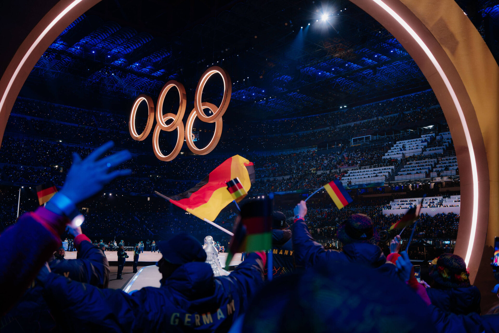 Angeführt vom Fahnenträger-Duo Leon Draisaitl (30/Edmonton Oilers) in Mailand und Katharina Schmid (29/SC Oberstdorf) in Predazzo zog Team Deutschland ein. Insgesamt nahmen 130 Athlet*innen von Team D an den verschiedenen Zeremonien teil. Team Deutschland lief gemäß olympischer Tradition, angeführt von den griechischen Athlet*innen, in alphabetischer Reihenfolge des Gastgeberlandes als 32. Nation hinter Georgien und vor Jamaika ein.